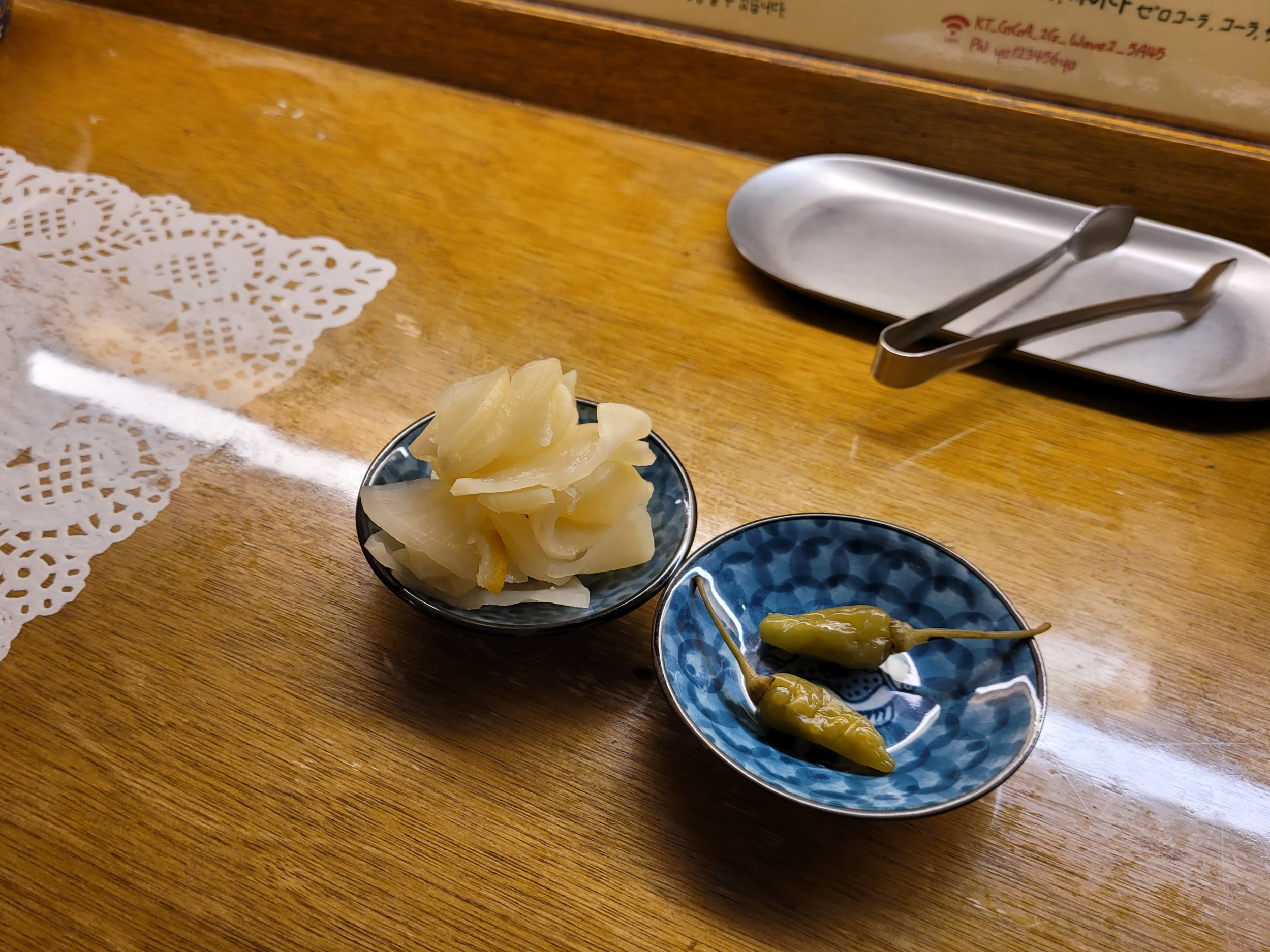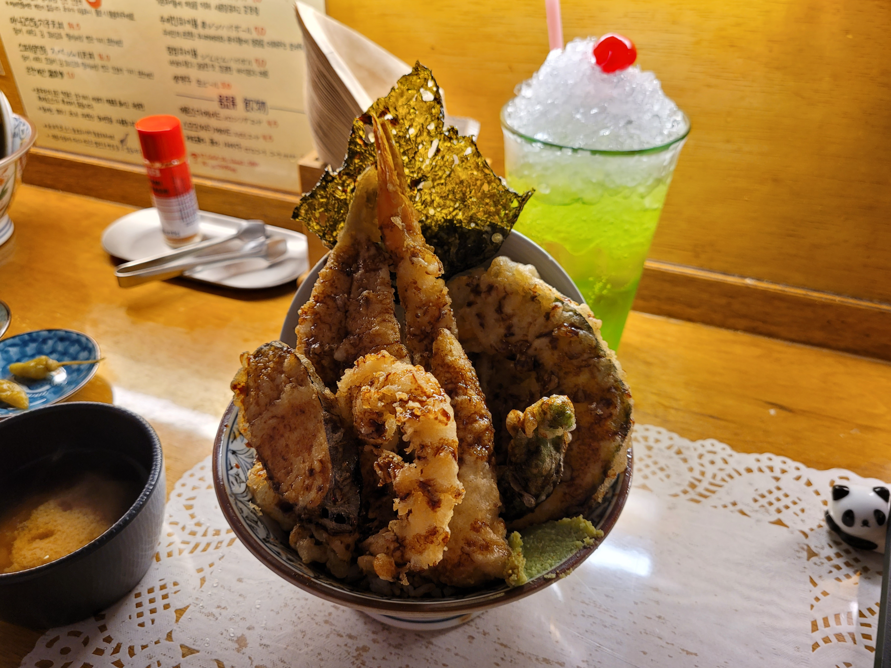 들어가서 앉으면 앞에 반찬통에 유자 단무지와 할라피뇨가 있다. 텐동이 튀김이다 보니 먹다 보면 좀 느끼한데 이 둘이 그걸 잘 잡아준다. 단무지는 짜지 않고 상큼해서 휘뚜루마뚜루 계속 집어먹기 좋고, 할라피뇨는 너무 느끼하다고 생각될 때 조금씩 깨물어 먹으면 느끼함이 싹 넘어간다.