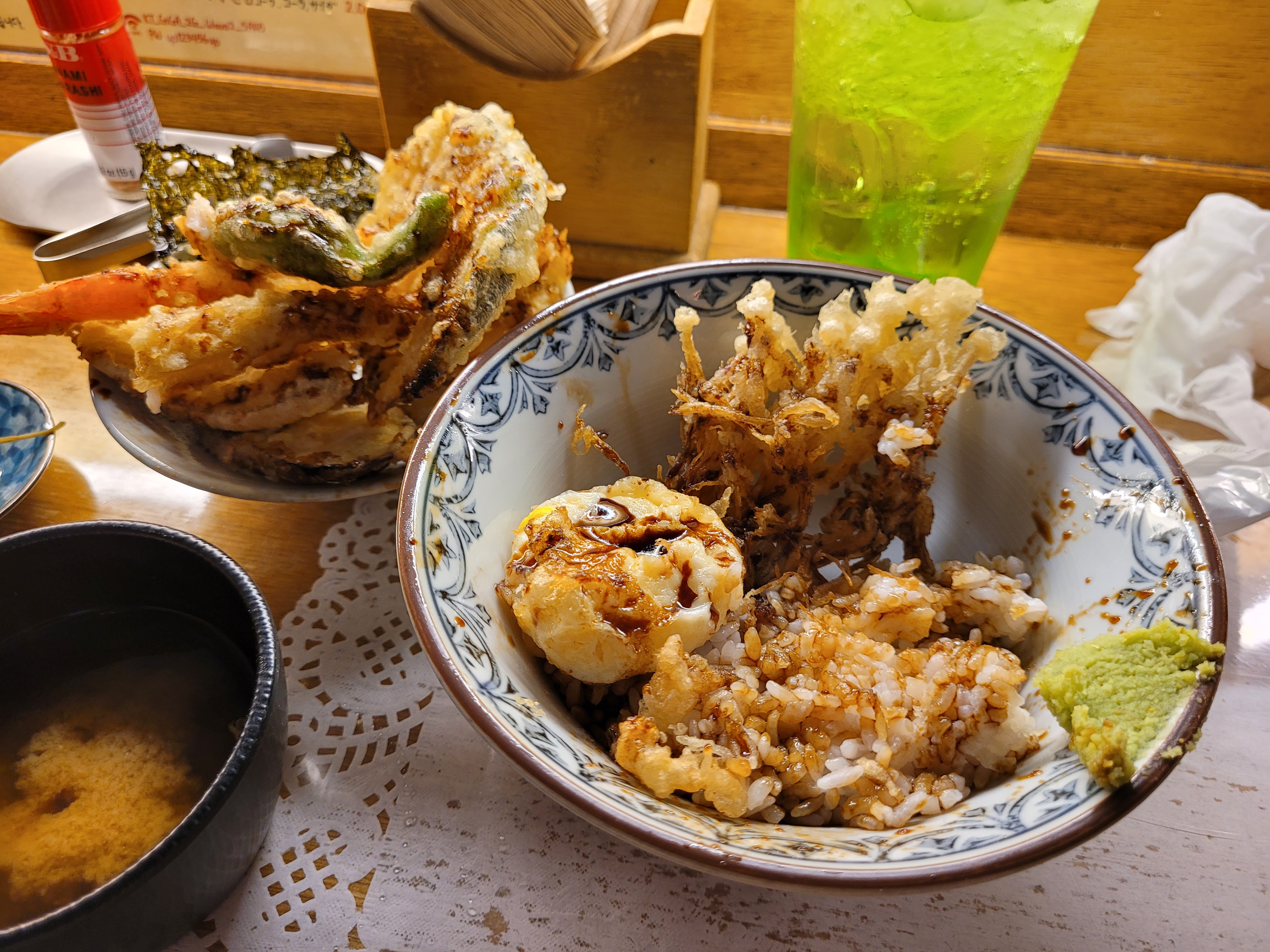 나오자마자 후다닥 사진 찍고 뒤에 있는 뚜껑을 빼서 튀김들을 빠르게 뚜껑에 옮겨준다. 그럼 더 오래 바삭하게 먹을 수 있다. 옆의 고추냉이는 조금씩 떠서 튀김과 같이 먹으면 된다. 팽이버섯이 특히나 아주 맛있다. 팽이버섯, 김과 같이 얇은 음식일수록 금방 눅눅해지니 제일 먼저 먹으면 좋다. 그리고 계란이 식기 전에 터뜨려서 밥과 같이 한 입. 감칠맛 돌면서 이거 먹으러 대전 오지..라는 생각을 한다. 그 외 튀김은 말해 뭐 하나! 아 참고로 여기는 얇고 파삭파삭한 식감의 튀김이다. 딱 내 취향. 여기 먹고 서울에서 다른 텐동 집들도 몇 번 가봤는데 첫 입부터 느끼하고 튀김도 두껍고 딱딱해서 다시는 요우란 외의 텐동집을 안 가게 됐다.